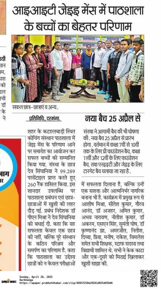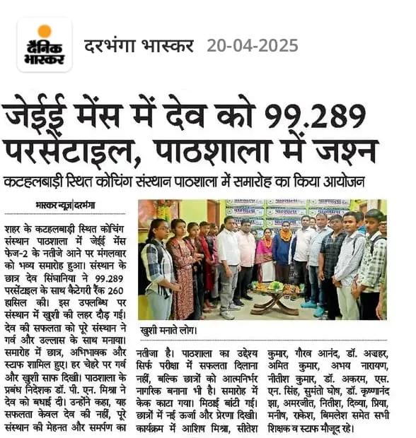 “Paathshaala Institute has been the foundation of my NEET success. The teachers guided me at every step — from building strong concepts to managing exam pressure. Their regular mock tests, doubt-clearing sessions, and personal motivation helped me stay consistent throughout my preparation. I’m proud to say that I secured admission at DMCH Darbhanga, and it wouldn’t have been possible without Paathshaala’s constant support.”